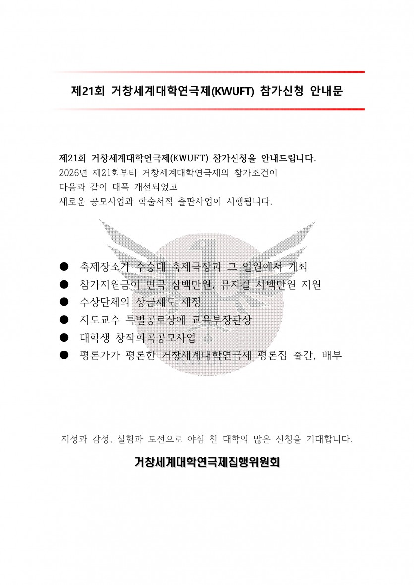 2026년 제21회 거창세계대학연극제(KWUFT) 참가 신청 안내 작성자 정보 최고관리자 작성 작성일 2026.03.25 16:39 컨텐츠 정보 522 조회 목록 본문 아래의 첨부파일(참가안내_제21회 거창세계대학연극제)을 다운받아 신청서를 작성해주세요. e-mail : kuft-2006@hanmail.net fax : 055-944-7109 관련자료 첨부 참가안내_제21회 거창세계대학연극제.hwp 파일크기 (1,001.5K) 173 회 다운로드 등록일 2026.03.26 09:24 이전 2026년 제21회 거창세계대학연극제 희곡 공모사업 안내 작성일 2026.03.25 16:48 다음 2025년 제20회 거창세계대학연극제 심사결과입니다. 작성일 2025.08.12 17:59 목록